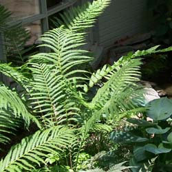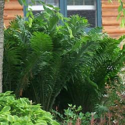 - Royal Fern (Osmunda regalis) – This fern forms a three-foot, vase-shaped clump of bright green fronds. Light brown spores are borne on the top of the fertile fronds. Royal fern does best in shade or sun and a moist organic soil.