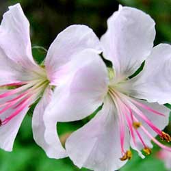G. ‘Biokovo’, originally found growing in the mountains of Croatia, is cold hardy and semi-evergreen in hardiness zones 5-8. Growing up to a foot tall and 12-18 inches wide, this cranesbill blooms in late spring, generally stretching from May to June with sporadic reblooming. The five-petaled, three-quarter-inch, white flowers show a tinge of pink in the center, surrounding brighter pink pistils topped with golden yellow stamens. The petals have a slightly frilly texture, giving these blooms a romantic delicacy. The leaves are slightly hairy, lobed, medium green, and develop an orange-red tint in the fall to provide beauty and color in different seasons. The foliage is highly aromatic with a pungent, orange-like scent when bruised.