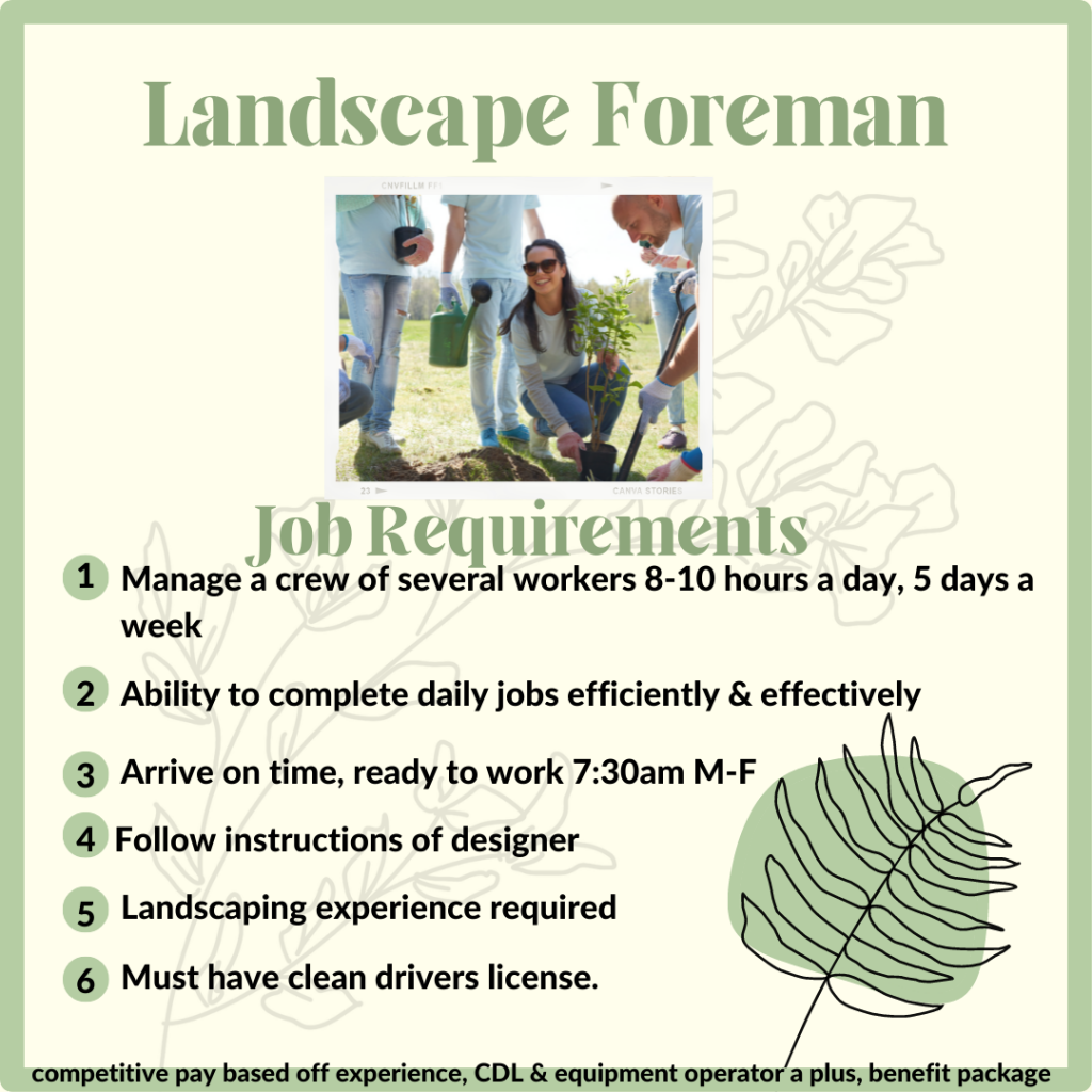 Must be able to work well with others to complete landscape tasks at hand. Candidate must be able to handle heavy objects at any given time. Must be available to work long hours and one weekend day when in busy seasons. CDL license a plus.