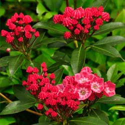 Broadleaf evergreen, 5-15 feet high x 5-15 feet wide. May-blooming with rose to white flowers with purple markings. Sun to part shade. Medium moist soil. Deer and rabbit tolerant.